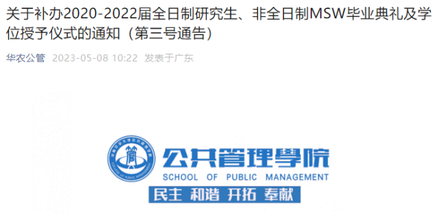 5月8日,華南農(nóng)業(yè)大學(xué)公共管理學(xué)院發(fā)布通知,決定為2020-2022屆全日制研究生、非全日制MSW補(bǔ)辦畢業(yè)典禮及學(xué)位授予儀式,畢業(yè)典禮及學(xué)位授予儀式以預(yù)約方式報(bào)名參加,時(shí)間定于5月20日(周六)。
