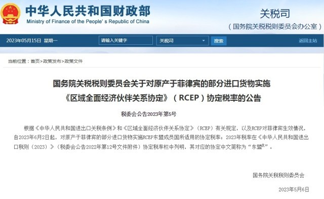 6月2日起中國將與菲律賓相互實施RCEP關稅減讓