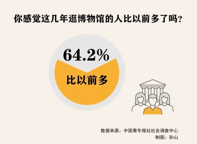 中青報(bào)社調(diào)中心的調(diào)查也顯示,超六成(64.2%)受訪者感覺這幾年逛博物館的人比以前多了。七成多(73.2%)受訪者表示去外地游玩,會(huì)把目的地博物館納入必到之地。