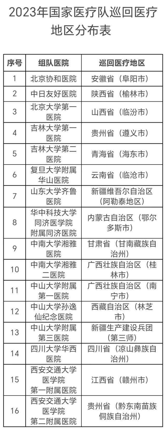 國家醫(yī)療隊的組隊醫(yī)院包括北京協(xié)和醫(yī)院、中日友好醫(yī)院等16家,分赴安徽、陜西等地,派出時間為6—10月。每支國家醫(yī)療隊不少于5人,以副高及以上職稱的醫(yī)務人員為主,重點開展巡回醫(yī)療、技術和管理指導、人員培訓、加強遠程醫(yī)療協(xié)作網(wǎng)建設等工作。工作時間不少于3周,其中在縣域開展工作的時間不少于兩周。