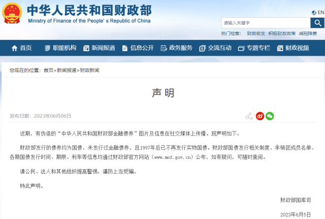央視網(wǎng)消息:6月6日,財(cái)政部網(wǎng)站發(fā)布聲明,近期,有偽造的“中華人民共和國(guó)財(cái)政部金融債券”圖片及信息在社交媒體上傳播。現(xiàn)聲明如下:
