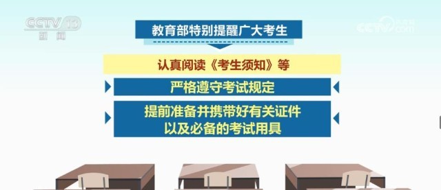 教育部特別提醒廣大考生,認真閱讀《考生須知》等,嚴格遵守考試規(guī)定,提前準備并攜帶好有關證件以及必備的考試用具。
