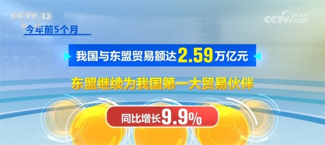 今年前5個(gè)月,我國與東盟貿(mào)易額達(dá)2.59萬億元,東盟繼續(xù)為我國第一大貿(mào)易伙伴,同比增長9.9%。