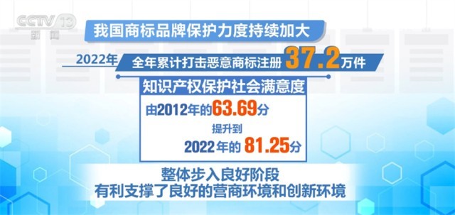 央視網(wǎng)消息:第十三屆中國國際商標(biāo)品牌節(jié)昨天(6月17日)在東莞開幕,國家知識(shí)產(chǎn)權(quán)局相關(guān)負(fù)責(zé)人介紹,我國商標(biāo)品牌保護(hù)力度持續(xù)加大,2022年全年累計(jì)打擊惡意商標(biāo)注冊37.2萬件,知識(shí)產(chǎn)權(quán)保護(hù)社會(huì)滿意度由2012年的63.69分提升到去年的81.25分,整體步入良好階段,有利支撐了良好的營商環(huán)境和創(chuàng)新環(huán)境。