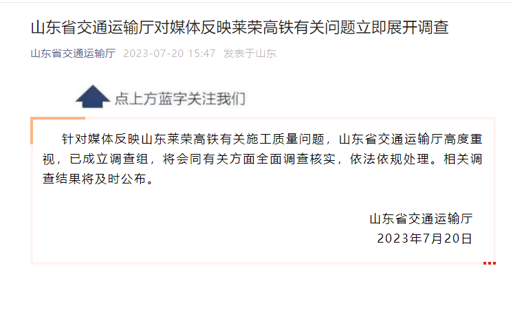 針對媒體反映山東萊榮高鐵有關(guān)施工質(zhì)量問題,山東省交通運(yùn)輸廳高度重視,已成立調(diào)查組,將會同有關(guān)方面全面調(diào)查核實,依法依規(guī)處理。相關(guān)調(diào)查結(jié)果將及時公布。