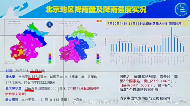 該消息配圖“北京地區(qū)降雨量及降雨強(qiáng)度實(shí)況”顯示,因電力、通訊基站故障,霞云嶺、齋堂2個(gè)國(guó)家站、房山23個(gè)(46個(gè))、門(mén)頭溝54個(gè)(60個(gè))、昌平6個(gè)、海淀1個(gè)自動(dòng)站數(shù)據(jù)中斷。請(qǐng)求中國(guó)氣象局給予支援和指導(dǎo)。