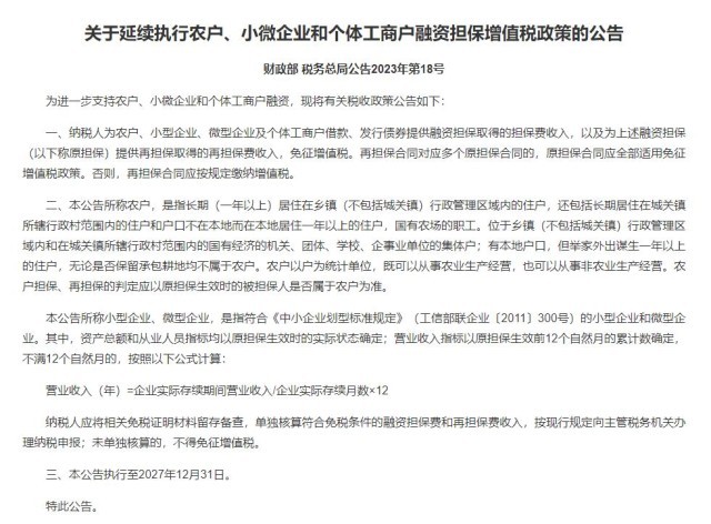 兩部門(mén):延續(xù)執(zhí)行農(nóng)戶、小微企業(yè)和個(gè)體工商戶融資擔(dān)保增值稅政策