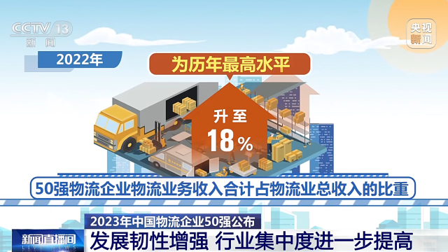 中國物流與采購聯(lián)合會今天發(fā)布了2023年度中國物流企業(yè)50強。從物流業(yè)務(wù)收入占比來看,50強物流企業(yè)的物流業(yè)務(wù)收入占物流業(yè)總收入的比重升至歷年最高,并且50強物流企業(yè)門檻大幅提高,顯示物流行業(yè)發(fā)展韌性較強,行業(yè)集中度進(jìn)一步提高。