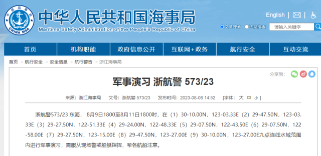據(jù)中國(guó)海事局網(wǎng)站消息,浙江海事局發(fā)布航行警告,8月9日18時(shí)至8月11日18時(shí),東海部分海域進(jìn)行軍事演習(xí),需服從現(xiàn)場(chǎng)警戒船艇指揮,希各航船注意。