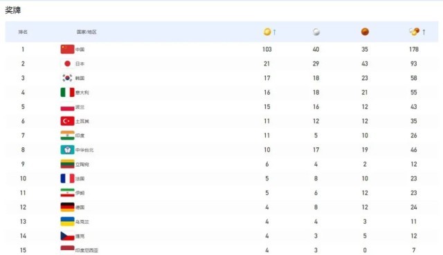 最終,中國(guó)代表團(tuán)以103枚金牌、40枚銀牌、35枚銅牌,總計(jì)178枚獎(jiǎng)牌的成績(jī),位列金牌榜和獎(jiǎng)牌榜雙第一。