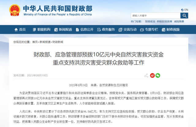 為堅(jiān)決貫徹落實(shí)習(xí)近平總書(shū)記重要指示和中央政治局常委會(huì)會(huì)議精神,按照黨中央、國(guó)務(wù)院決策部署,8月19日,財(cái)政部會(huì)同應(yīng)急管理部再次預(yù)撥10億元中央自然災(zāi)害救災(zāi)資金,重點(diǎn)支持京津冀及黑龍江、吉林等受災(zāi)嚴(yán)重地區(qū)做好受災(zāi)群眾救助等工作,保障受災(zāi)群眾得到妥善安置,及早恢復(fù)災(zāi)區(qū)正常生產(chǎn)生活秩序,入冬前能夠回家或搬入新居。