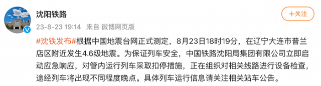 央視網(wǎng)消息:據(jù)@沈陽鐵路 微博消息,根據(jù)中國地震臺(tái)網(wǎng)正式測(cè)定,8月23日18時(shí)19分,在遼寧大連市普蘭店區(qū)附近發(fā)生4.6級(jí)地震。為保證列車安全,中國鐵路沈陽局集團(tuán)有限公司立即啟動(dòng)應(yīng)急響應(yīng),對(duì)管內(nèi)運(yùn)行列車采取扣停措施,正在組織對(duì)相關(guān)線路進(jìn)行設(shè)備檢查,途經(jīng)列車將出現(xiàn)不同程度晚點(diǎn)。具體列車運(yùn)行信息請(qǐng)關(guān)注相關(guān)站車公告。