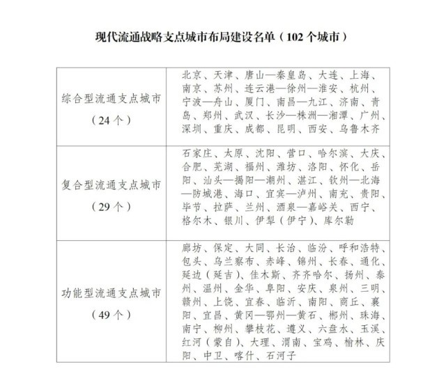 《通知》堅持系統(tǒng)思維和全局觀念,突出國家所需和城市所長,按照服務重要商品和資源要素流通、強化跨域跨界輻射帶動、促進現(xiàn)代流通發(fā)展等三個維度布局流通支點城市。綜合考慮城市資源稟賦、發(fā)展基礎、比較優(yōu)勢、未來潛力,將102個城市納入布局建設范圍,覆蓋全國31個省區(qū)市以及新疆生產(chǎn)建設兵團。流通支點城市將按綜合型、復合型、功能型分類推進建設,城市人民政府發(fā)揮主體作用部署推進,努力提升自身發(fā)展水平,增強輻射帶動作用。