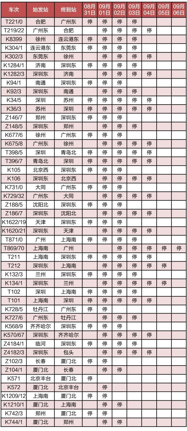 “長三角鐵路”消息:受第9號臺(tái)風(fēng)“蘇拉”影響,為確保列車運(yùn)行安全,鐵路部門計(jì)劃對杭深線、京港高鐵、廣深城際、廣深港高鐵、穗深城際、京九線等線路運(yùn)行的部分列車采取停運(yùn)措施,計(jì)劃停運(yùn)8月31日至9月6日間共121趟旅客列車:其中停運(yùn)動(dòng)車組列車74趟,停運(yùn)普速列車47趟。(停運(yùn)列車車次信息見附表)