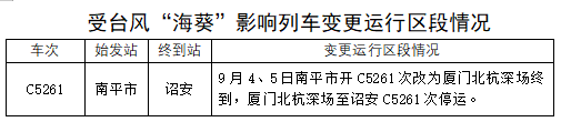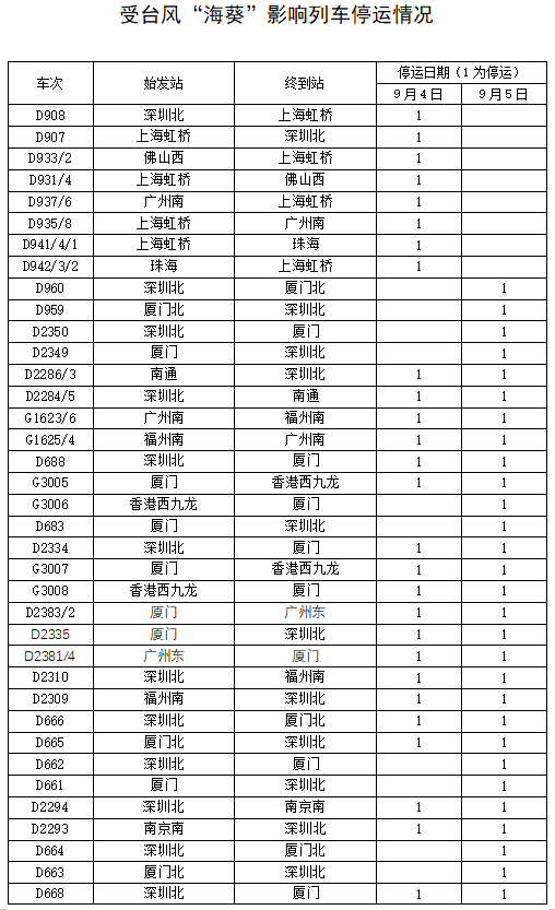 據(jù)中央氣象臺消息,今年第11號臺風(fēng)“海葵”將于5日凌晨到上午在福建漳浦至廣東惠來一帶沿海登陸,福建東部部分地區(qū)可能有大到暴雨,福建東南部部分地區(qū)有大暴雨,局地特大暴雨。為防范臺風(fēng)影響,保障運(yùn)輸安全,中國鐵路南昌局集團(tuán)有限公司調(diào)整部分旅客列車運(yùn)行方案,停運(yùn)途經(jīng)杭深線管內(nèi)漳州(不含)至詔安區(qū)段旅客列車。