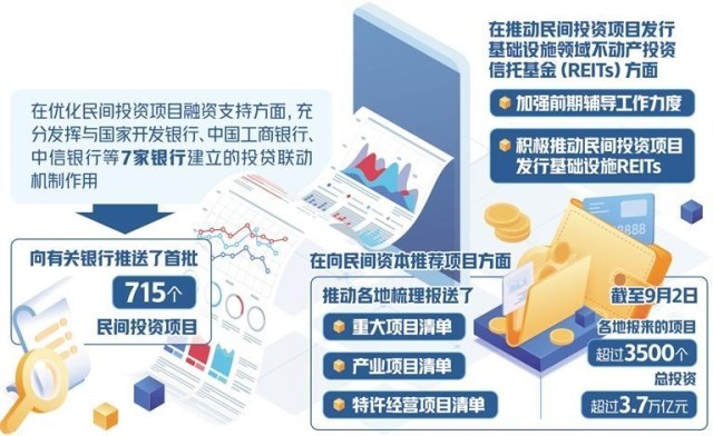 為貫徹落實《意見》,國家發(fā)展改革委印發(fā)了《關(guān)于進一步抓好抓實促進民間投資工作努力調(diào)動民間投資積極性的通知》,提出了17項有針對性的具體措施。據(jù)介紹,在優(yōu)化民間投資項目融資支持方面,充分發(fā)揮與國家開發(fā)銀行、中國工商銀行、中信銀行等7家銀行建立的投貸聯(lián)動機制作用,向有關(guān)銀行推送了首批715個民間投資項目,請有關(guān)金融機構(gòu)按照市場化、法治化原則,自主選擇符合條件的項目給予金融支持。在向民間資本推薦項目方面,推動各地梳理報送了重大項目清單、產(chǎn)業(yè)項目清單、特許經(jīng)營項目清單。截至9月2日,各地報來的項目超過3500個,總投資超過3.7萬億元。在推動民間投資項目發(fā)行基礎(chǔ)設(shè)施領(lǐng)域不動產(chǎn)投資信托基金(REITs)方面,加強前期輔導(dǎo)工作力度,積極推動民間投資項目發(fā)行基礎(chǔ)設(shè)施REITs。近日,國家發(fā)展改革委向證監(jiān)會推薦了金風(fēng)科技風(fēng)力發(fā)電項目,這是推薦的首單民間投資清潔能源REITs項目。