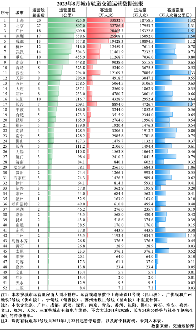 央視網(wǎng)消息:交通運(yùn)輸部發(fā)布2023年8月城市軌道交通運(yùn)營(yíng)數(shù)據(jù)速報(bào),2023年8月,31個(gè)?。ㄗ灾螀^(qū)、直轄市)和新疆生產(chǎn)建設(shè)兵團(tuán)共有54個(gè)城市開(kāi)通運(yùn)營(yíng)城市軌道交通線路297條,運(yùn)營(yíng)里程9771.8公里,實(shí)際開(kāi)行列車(chē)325萬(wàn)列次,完成客運(yùn)量27.1億人次,進(jìn)站量16.3億人次。8月份,客運(yùn)量環(huán)比增加0.4億人次、增長(zhǎng)1.7%,同比增加7.5億人次、增長(zhǎng)38.4%,較2019年月均客運(yùn)量增加7.2億人次、增長(zhǎng)36.0%。8月份客運(yùn)強(qiáng)度平均水平為0.556萬(wàn)人次每公里日,較2019年全年客運(yùn)強(qiáng)度平均水平增長(zhǎng)1.9%。