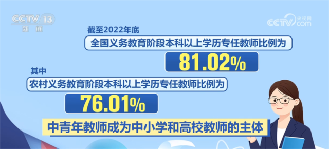 近年來,“特崗計劃”、“三區(qū)”人才支持計劃教師專項計劃等源源不斷地為鄉(xiāng)村學(xué)校補充高素質(zhì)教師。優(yōu)師計劃、師范教育協(xié)同提質(zhì)計劃、國優(yōu)計劃等的實施,也在助力優(yōu)秀教師的培養(yǎng)。我國各級各類教師隊伍學(xué)歷不斷提高、年齡結(jié)構(gòu)不斷優(yōu)化。截至2022年底,全國義務(wù)教育階段本科以上學(xué)歷專任教師比例為81.02%,其中,農(nóng)村義務(wù)教育階段本科以上學(xué)歷專任教師比例為76.01%,中青年教師成為中小學(xué)和高校教師的主體。