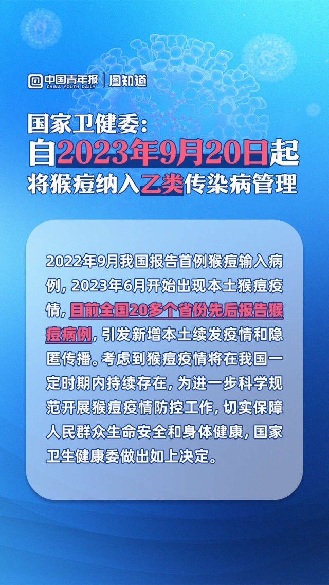 今年以來(lái),我國(guó)已有20多個(gè)省份先后報(bào)告猴痘病例,引發(fā)新增本土續(xù)發(fā)疫情和隱匿傳播。國(guó)家衛(wèi)健委9月15日發(fā)布公告稱,自2023年9月20日起將猴痘納入乙類傳染病進(jìn)行管理,采取乙類傳染病的預(yù)防、控制措施。