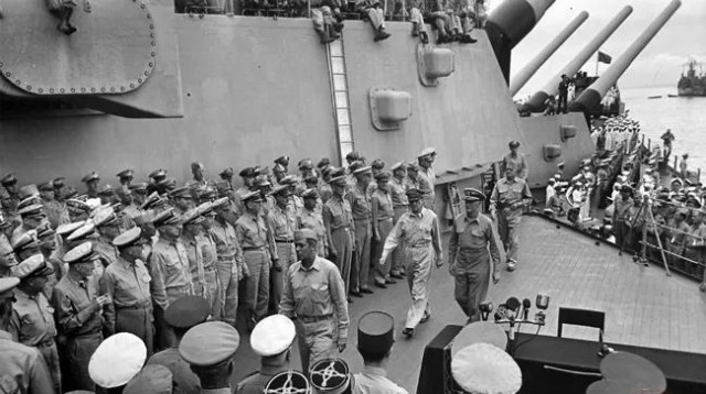停泊于東京灣的美國戰(zhàn)列艦“密蘇里”號上舉行向同盟國投降的簽降儀式