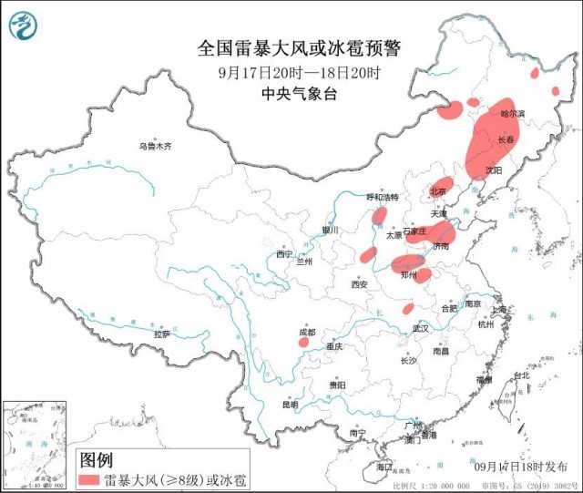 中央氣象臺(tái)9月17日18時(shí)繼續(xù)發(fā)布強(qiáng)對(duì)流天氣藍(lán)色預(yù)警