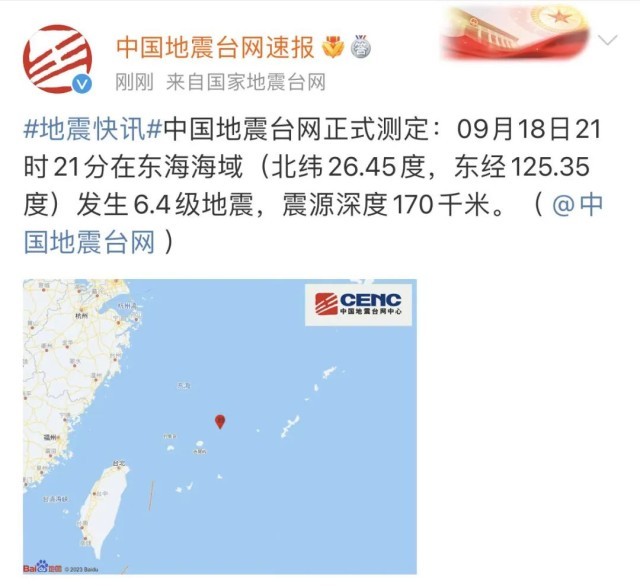 此前,經(jīng)中國地震臺網(wǎng)自動測定:09月18日21時21分在中國臺灣東北附近(北緯26.30度,東經(jīng)125.38度)發(fā)生6.7級左右地震(最終結(jié)果以正式速報為準)。