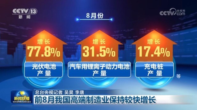 8月份,主要新能源產品兩位數(shù)增長,新能源汽車產量同比增長13.8%,帶動光伏電池、汽車用鋰離子動力電池、充電樁等產品產量分別增長77.8%、31.5%、17.4%;新材料產品生產保持高速增長,太陽能工業(yè)用超白玻璃、多晶硅、單晶硅等產品產量分別增長63.3%、84.6%、79.9%。