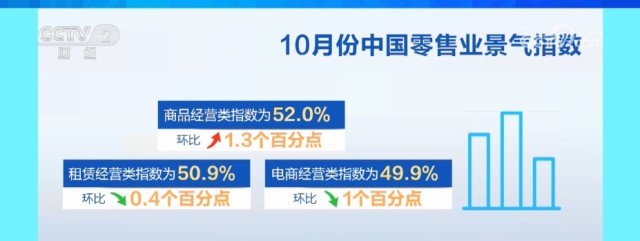 央視網(wǎng)消息:10月9日,中國商業(yè)聯(lián)合會(huì)發(fā)布10月份中國零售業(yè)景氣指數(shù)為51.3%,較上月微升0.5個(gè)百分點(diǎn),創(chuàng)近一年新高。