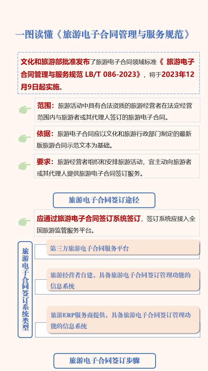 日前,文化和旅游部批準(zhǔn)發(fā)布了旅游電子合同領(lǐng)域的行業(yè)標(biāo)準(zhǔn)《旅游電子合同管理與服務(wù)規(guī)范》(以下簡(jiǎn)稱(chēng)“標(biāo)準(zhǔn)”),將于2023年12月9日起實(shí)施。文化和旅游部今天正式發(fā)布該規(guī)范的解讀。