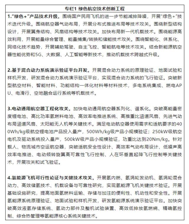 1.強化綠色航空關(guān)鍵核心技術(shù)攻關(guān)。持續(xù)推動總體、氣動、結(jié)構(gòu)、發(fā)動機、機載、材料、制造工藝等領(lǐng)域技術(shù)升級換代,加速發(fā)展混合動力推進系統(tǒng),不斷提升干支線飛機、通用航空器節(jié)能減排降噪水平。加快發(fā)展高能量密度、高放電效率、高安全性的航空動力電池技術(shù),以及高可靠性、高功重比、高效率的航空電推進技術(shù)。加強高效燃氣渦輪-電能融合技術(shù)研究。引導(dǎo)優(yōu)勢企業(yè)和研究機構(gòu)持續(xù)突破智能化、高可靠性、輕量化、低成本能量控制和飛行控制技術(shù),開展新能源飛機總體設(shè)計、能源系統(tǒng)設(shè)計、全電機載系統(tǒng)等技術(shù)攻關(guān)。持續(xù)探索氫燃料存儲技術(shù)、氫燃料電池技術(shù)、氫內(nèi)燃、氫渦輪發(fā)動機技術(shù)、氫渦輪混合電推進技術(shù)、能量綜合管理技術(shù)等氫能源飛機關(guān)鍵技術(shù)。面向國家綠色航空發(fā)展的戰(zhàn)略需要,加快布局基礎(chǔ)研究和應(yīng)用基礎(chǔ)研究,解決制約綠色航空發(fā)展的源頭和底層技術(shù)問題。
