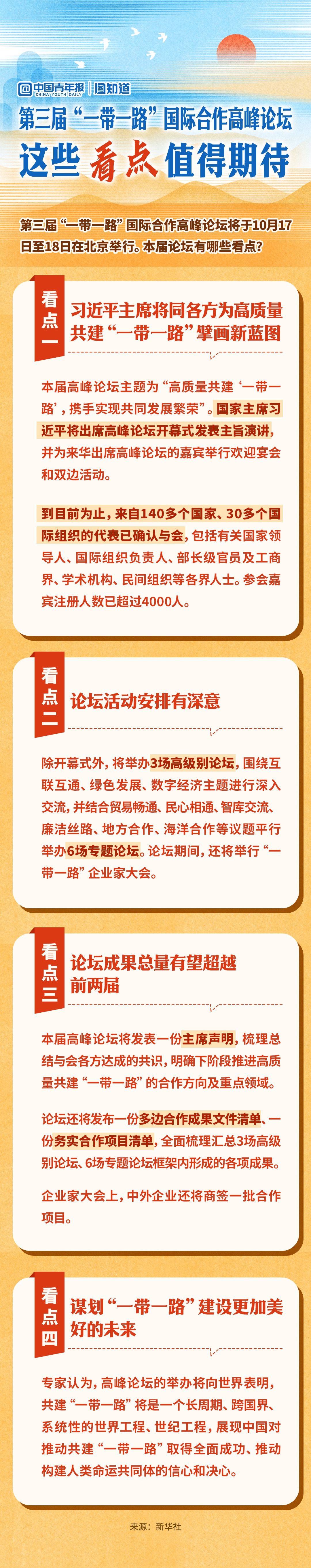 第三屆“一帶一路”國(guó)際合作高峰論壇將于10月17日至18日在北京舉行。本屆論壇有哪些看點(diǎn)?一圖查看,共同期待論壇的豐厚成果!