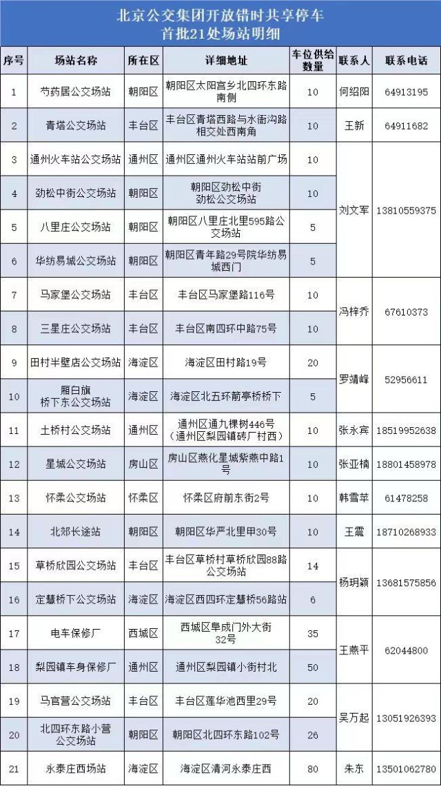 北京公交集團提醒,首批21處場站周邊居民如有停車需求,可與相關場站管理單位取得聯系,進一步了解錯時共享停車的服務內容。