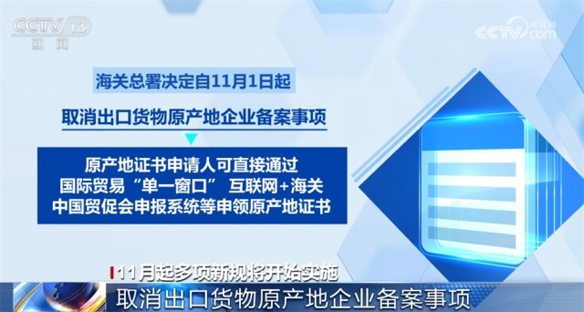 海關總署決定自11月1日起,取消出口貨物原產地企業(yè)備案事項,原產地證書申請人可直接通過國際貿易“單一窗口”“互聯網+海關”、中國貿促會申報系統(tǒng)等申領原產地證書,進一步優(yōu)化跨境貿易營商環(huán)境,提升貿易便利。