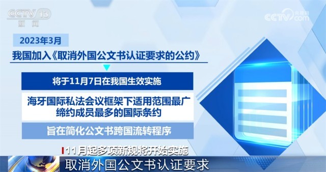 今年3月,我國加入《取消外國公文書認證要求的公約》,《公約》將于11月7日在我國生效實施?!豆s》是海牙國際私法會議框架下適用范圍最廣、締約成員最多的國際條約,旨在簡化公文書跨國流轉程序。11月7日起,中國送往其他締約國使用的公文書僅需辦理《公約》規(guī)定的附加證明書,即可送其他締約國使用,無需辦理中國和締約國駐華使領館的領事認證。其他締約國公文書送中國內地使用,只需辦理該國附加證明書,無需辦理該國和中國駐當地使領館的領事認證。