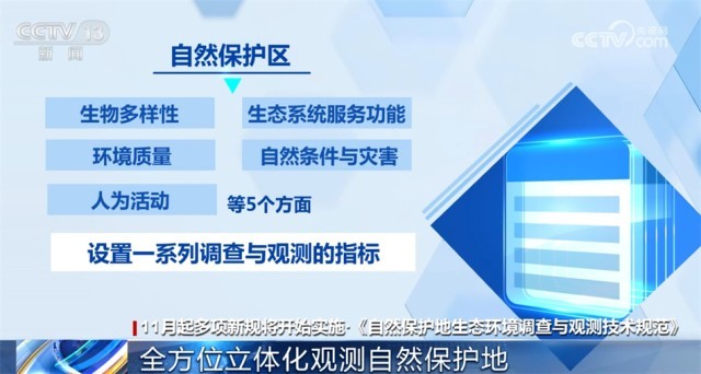 生態(tài)環(huán)境部發(fā)布的《自然保護地生態(tài)環(huán)境調查與觀測技術規(guī)范》將從11月1日起施行?!都夹g規(guī)范》對自然保護區(qū)的生物多樣性、生態(tài)系統(tǒng)服務功能、環(huán)境質量、自然條件與災害和人為活動等5個方面設置了一系列調查與觀測的指標,將綜合利用“天空地”各種觀測技術手段,形成集“遙感監(jiān)測、地面觀測與實地調查、資料收集與調查統(tǒng)計”等多種方法相結合的全方位、立體化調查與觀測技術體系。