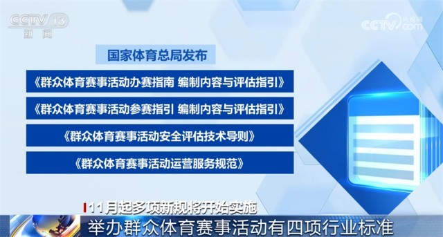 國家體育總局發(fā)布的《群眾體育賽事活動辦賽指南 編制內容與評估指引》《群眾體育賽事活動參賽指引 編制內容與評估指引》《群眾體育賽事活動安全評估技術導則》《群眾體育賽事活動運營服務規(guī)范》四項體育行業(yè)標準自11月1日起實施。這些標準明確了群眾體育賽事活動安全評估的流程、策劃、實施和總結,運營服務的基本要求、服務要求、管理要求等內容,適用于各級各類群眾體育賽事活動的舉辦。