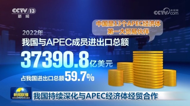 央視網(wǎng)消息(新聞聯(lián)播):商務(wù)部最新數(shù)據(jù)顯示,2022年,我國與APEC成員進(jìn)出口總額為37390.8億美元,占我國進(jìn)出口總額的59.7%。中國是13個(gè)APEC經(jīng)濟(jì)體的第一大貿(mào)易伙伴。
