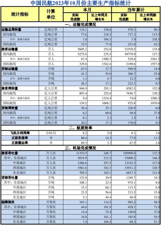 民航局11月20日發(fā)布10月份主要生產(chǎn)指標統(tǒng)計顯示,今年10月,運輸總周轉(zhuǎn)量達到110.1億噸公里,同比增長158.6%;中國民航旅客運輸量達到5605.2萬人,同比增長252%;10月貨郵運輸量為67.5萬噸,同比增長37.7%。