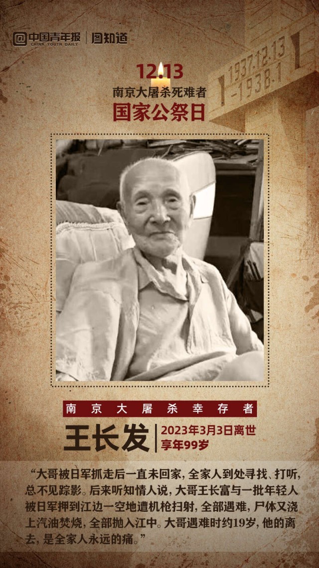 在侵華日軍南京大屠殺遇難同胞紀(jì)念館,有一面南京大屠殺幸存者照片墻。每有一位登記在冊的幸存者離世,就會熄滅一盞燈。但是,他們在生前通過口述等方式將歷史記憶留給了我們。一個個體的生命可能有盡頭,但一個國家、一個民族的記憶將代代相傳。今天是南京大屠殺死難者國家公祭日,共同走近這些老人,他們離去了,但我們可以點(diǎn)亮一盞名為記憶的燈。