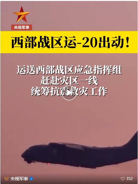 今天上午9時(shí)50分左右,西部戰(zhàn)區(qū)空軍1架運(yùn)-20從西南某軍用機(jī)場起飛,運(yùn)送西部戰(zhàn)區(qū)應(yīng)急指揮組趕赴災(zāi)區(qū)一線,統(tǒng)籌抗震救災(zāi)工作。運(yùn)-20已于11點(diǎn)左右抵達(dá)蘭州中川機(jī)場。