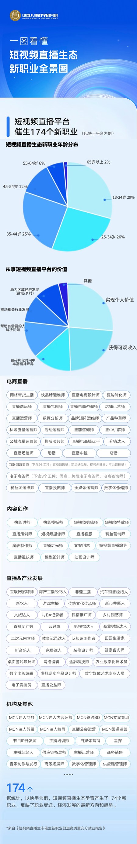 中國(guó)人事科學(xué)研究院近期發(fā)布的《短視頻直播生態(tài)催生新職業(yè)促進(jìn)高質(zhì)量充分就業(yè)報(bào)告》顯示,一塊屏幕背后發(fā)生了諸多變化:中青年成短視頻直播生態(tài)新職業(yè)的主力軍。其中,18-24歲占29%,25-34歲占26%,35-44歲占25%。18-34歲占比達(dá)到55%?!吨腥A人民共和國(guó)職業(yè)分類大典(2022年版)》的1639個(gè)職業(yè)中,短視頻平臺(tái)快手覆蓋八成以上的數(shù)字職業(yè),為勞動(dòng)者提供了更廣闊的職業(yè)發(fā)展空間。