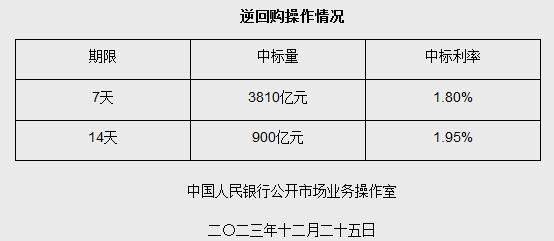 中新網(wǎng)12月25日電 據(jù)央行網(wǎng)站消息,為維護(hù)年末流動(dòng)性合理充裕,2023年12月25日人民銀行以利率招標(biāo)方式開展了4710億元7天期和14天期逆回購(gòu)操作。具體情況如下: