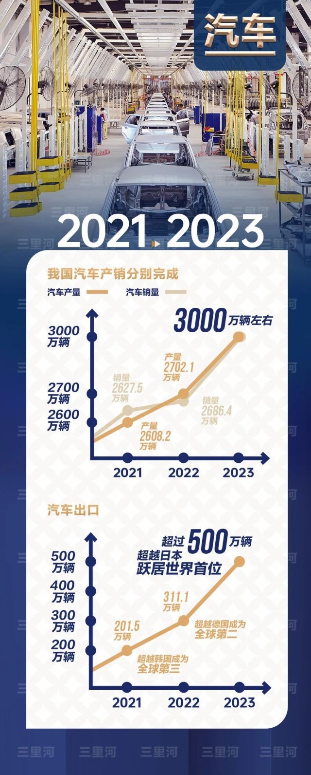 2023年,全年汽車產(chǎn)銷量預(yù)計達(dá)3000萬輛左右、創(chuàng)歷史新高,出口超過500萬輛,超越日本,躍居世界首位。
