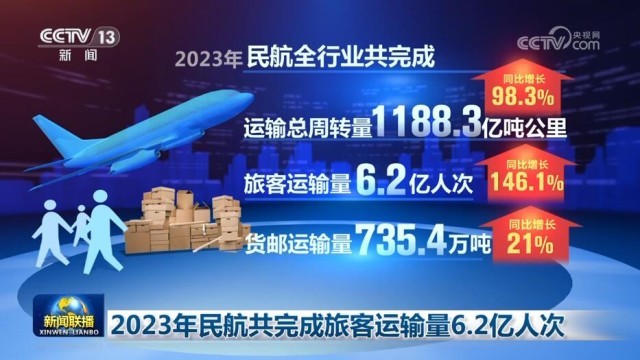 2023年,民航全行業(yè)共完成運輸總周轉量1188.3億噸公里、旅客運輸量6.2億人次、貨郵運輸量735.4萬噸,同比分別增長98.3%、146.1%和21%。飛機日利用率8.1小時,同比提高3.8小時;全行業(yè)大幅減虧1872億元。國內航線客運規(guī)模在各類交通運輸方式中恢復速度最快。國際客運航班從年初的每周不到500班恢復至目前4600余班,增長9.6倍,復航國家數量達到疫情前89.2%。