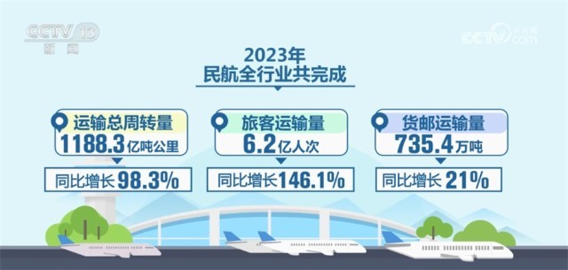 2023年,民航全行業(yè)共完成運輸總周轉量1188.3億噸公里、旅客運輸量6.2億人次、貨郵運輸量735.4萬噸,同比分別增長98.3%、146.1%和21%。飛機日利用率8.1小時,同比提高3.8小時;全行業(yè)大幅減虧1872億元。國內航線客運規(guī)模在各類交通運輸方式中恢復速度最快。國際客運航班從年初的每周不到500班恢復至目前4600余班,增長9.6倍,復航國家數(shù)量達到疫情前89.2%。