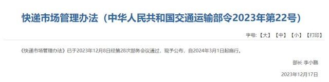 央視網(wǎng)消息:《快遞市場管理辦法》已于2023年12月8日經(jīng)第28次部務(wù)會議通過,現(xiàn)予公布,自2024年3月1日起施行。