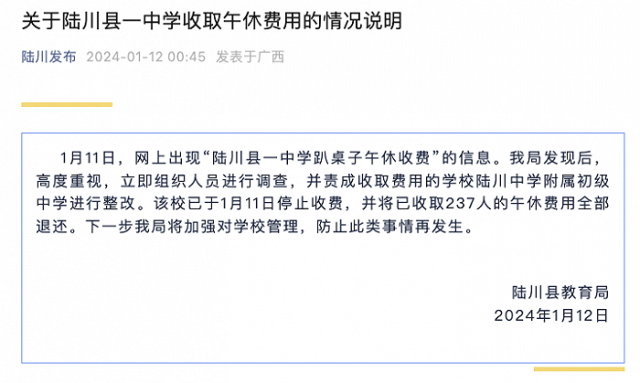 央視網(wǎng)消息:據(jù)“陸川發(fā)布”公眾號(hào)消息,1月12日,廣西陸川縣教育局通報(bào)關(guān)于一中學(xué)收取午休費(fèi)用的情況說明:1月11日,網(wǎng)上出現(xiàn)“陸川縣一中學(xué)趴桌子午休收費(fèi)”的信息,教育局立即組織人員進(jìn)行調(diào)查,并責(zé)成收取費(fèi)用的學(xué)校陸川中學(xué)附屬初級(jí)中學(xué)進(jìn)行整改。該校已于1月11日停止收費(fèi),并將已收取237人的午休費(fèi)用全部退還。下一步將加強(qiáng)對(duì)學(xué)校管理,防止此類事情再發(fā)生。