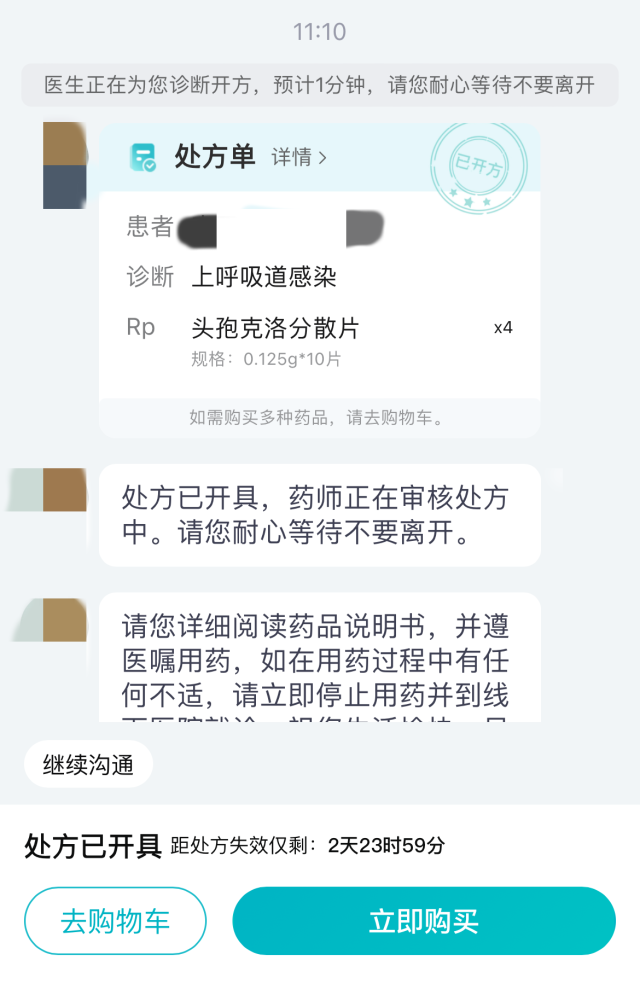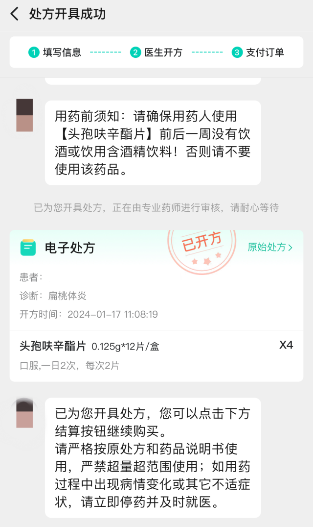 “您好,我是醫(yī)生XX,已收到您的復(fù)診開藥訴求,正在為您診斷開方,預(yù)計(jì)1分鐘,請不要離開……”自動發(fā)來三條問話后,記者并未回復(fù)任何信息,一份電子處方就順利開出。只需完成支付,處方藥就可以送貨上門。