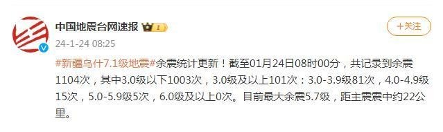 截至24日8時(shí) 新疆烏什7.1級(jí)地震共記錄到余震1104次