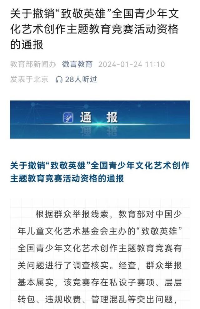 教育部1月24日通報,根據(jù)群眾舉報線索,教育部對中國少年兒童文化藝術(shù)基金會主辦的“致敬英雄”全國青少年文化藝術(shù)創(chuàng)作主題教育競賽有關(guān)問題進(jìn)行了調(diào)查核實。經(jīng)查,群眾舉報基本屬實,該競賽存在私設(shè)子賽項、層層轉(zhuǎn)包、違規(guī)收費(fèi)、管理混亂等突出問題,在社會上造成了惡劣影響。